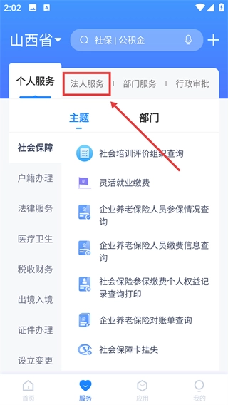2、在服务页面找到并点击【法人服务】标签,即可切换到法人相关的服务列表界面。
