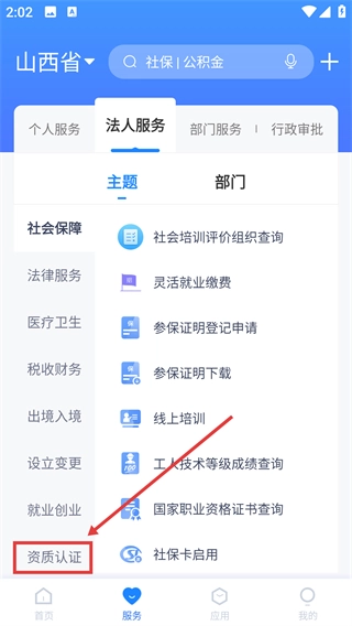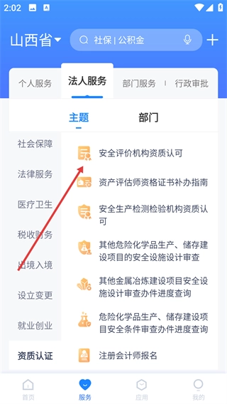 3、在法人服务的主题分类里,找到并点击【资质认证】这一选项,就能查看与之对应的各类资质相关服务了。