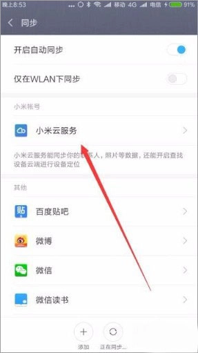 3、此时会弹出同步设置页面,在该页面里点击“小米云服务”这个菜单项。