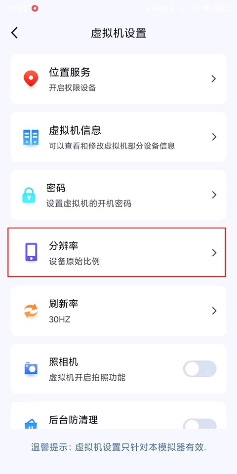 2、接着在虚拟机设置界面,找到【分辨率】。