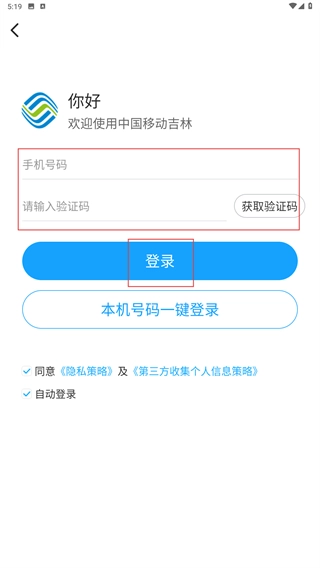 1、可选用【本机号码一键登录】等多种登录途径,勾选协议后,就能快速完成中国移动吉林账号的登录操作。