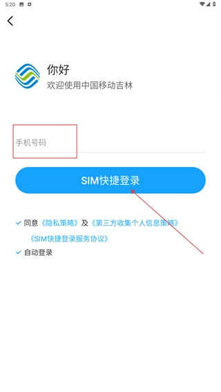 3、SIM快捷登录页面,在确认手机号无误后点击【SIM快捷登录】按钮,系统将借助SIM卡信息自动完成登录流程。