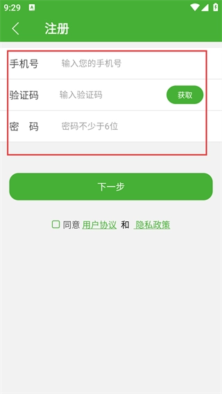 4、进入注册页面后,填写【手机号-输入您的手机号】,并填写验证码和密码。