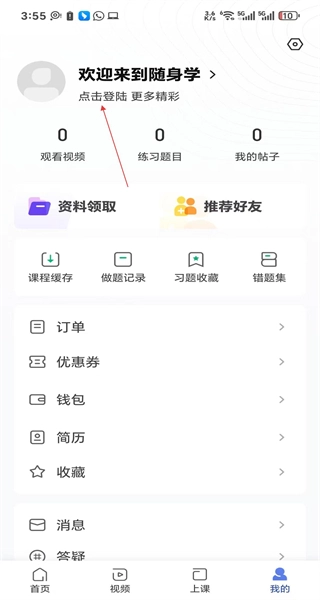 2、进入“我的”页面后,在页面上能看到资料领取、课程缓存等功能选项,接着点击头像所在的区域,即可进入账号登录的操作页面。