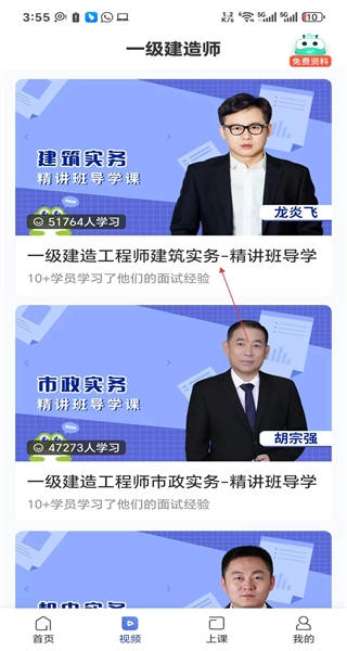 4、回到软件的视频板块,查看建筑实务、市政实务等精讲班的导学课,了解各课程的学习人数和具体内容。