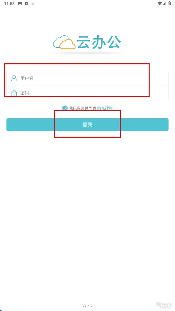 3、进入登录页面后,依次填写【用户名】与【密码】,勾选同意隐私政策的选项,再点击【登录】功能按钮完成操作。