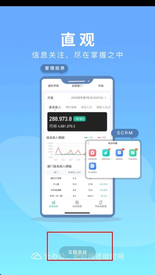 1、点击【立即启动】功能按钮,进入云办公隐私政策页面。
