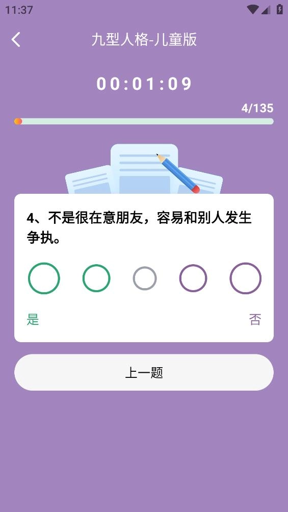 九型人格测试是一款面向心理学及人格分析爱好者的应用。依托科学的九型人格理论,它能助力用户进一步认识自身的个性特质与行为模式,并给出个性化的成长指导。其简洁友好的界面设计与准确的分析结论,让这款应用广受青睐。