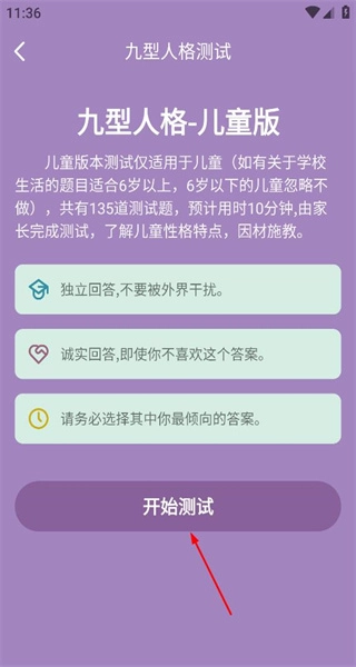 2、进入九型人格儿童版页面后,先仔细阅读测试适用说明和答题要求,随后点击“开始测试”按钮,即可进入测试答题界面。