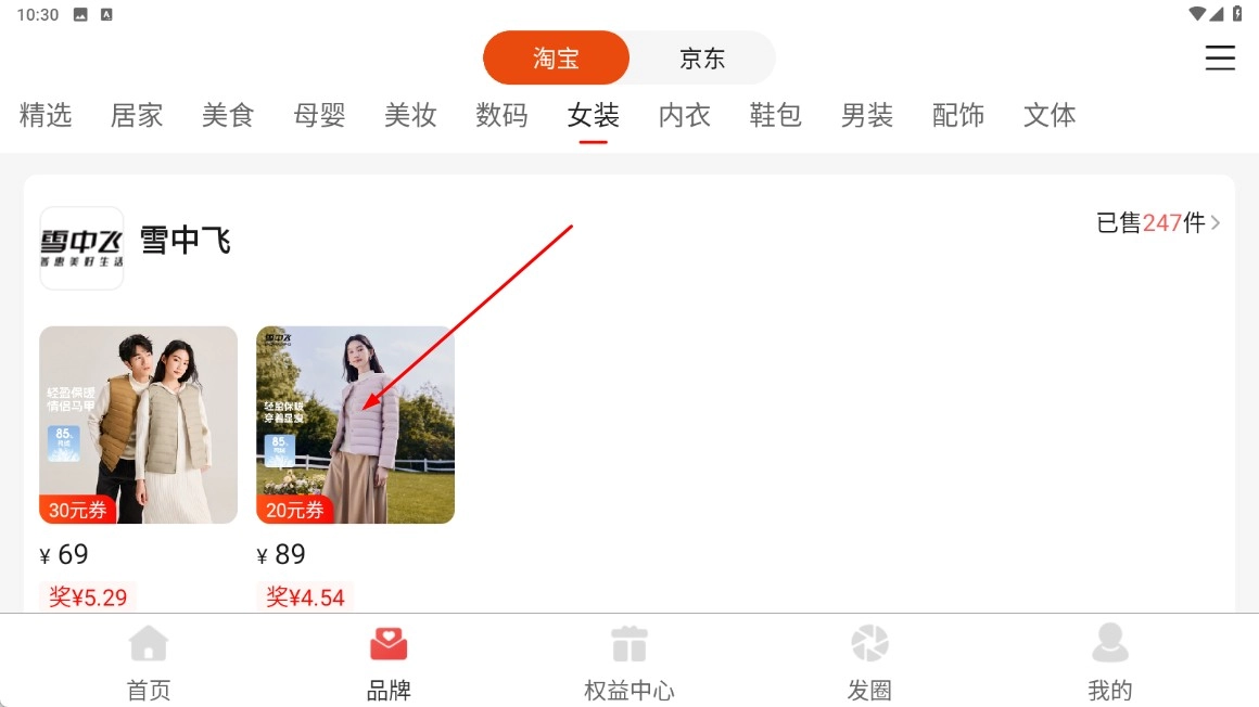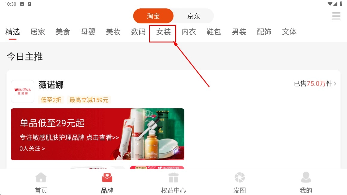 2、在品牌页面中,点击【女装-分类标签】,即可切换至女装商品列表页面。