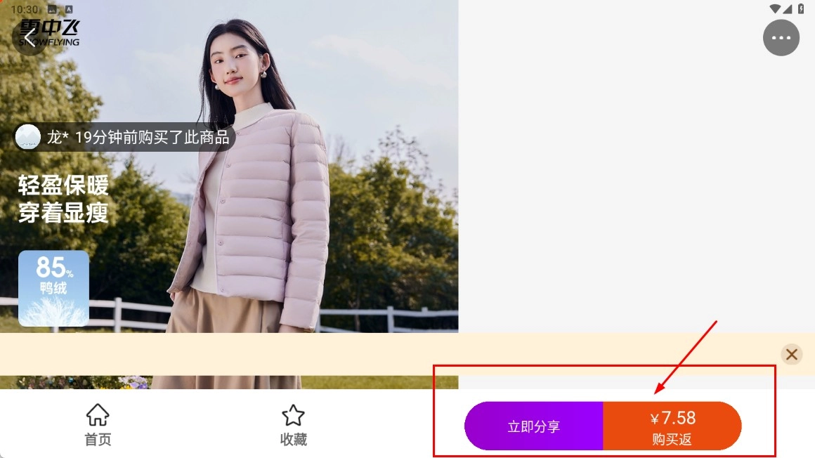 4、在商品详情页面,您可以选择点击【立即分享】按钮,也能查看【购买返】的具体金额,进而开展对应的操作。