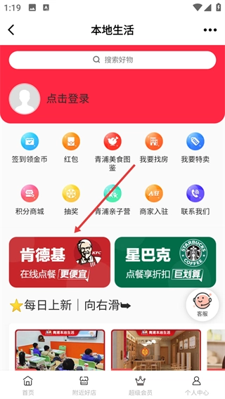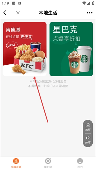 在本地生活页面,找到【肯德基】的在线点餐入口,点击进入对应的点餐页面。