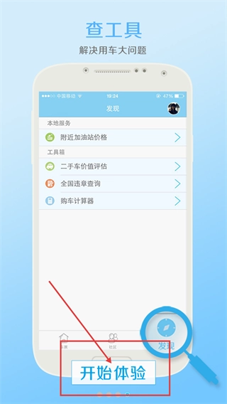 1、当前处于查工具引导页,此页面呈现了附近加油站油价、二手车价值评估等用车相关工具,点击【开始体验】按钮。