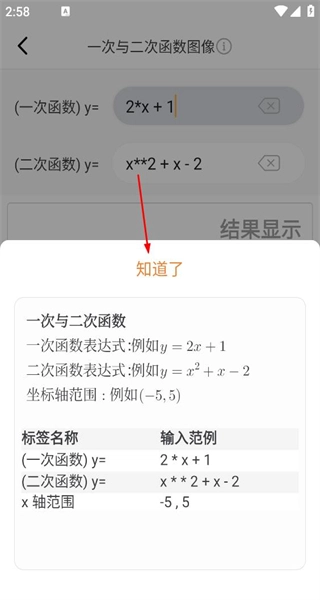 3、进入后会弹出功能提示弹窗,其中包含一次函数与二次函数的示例信息,了解这些内容后点击“知道了”按钮,即可进入表达式编辑页面。