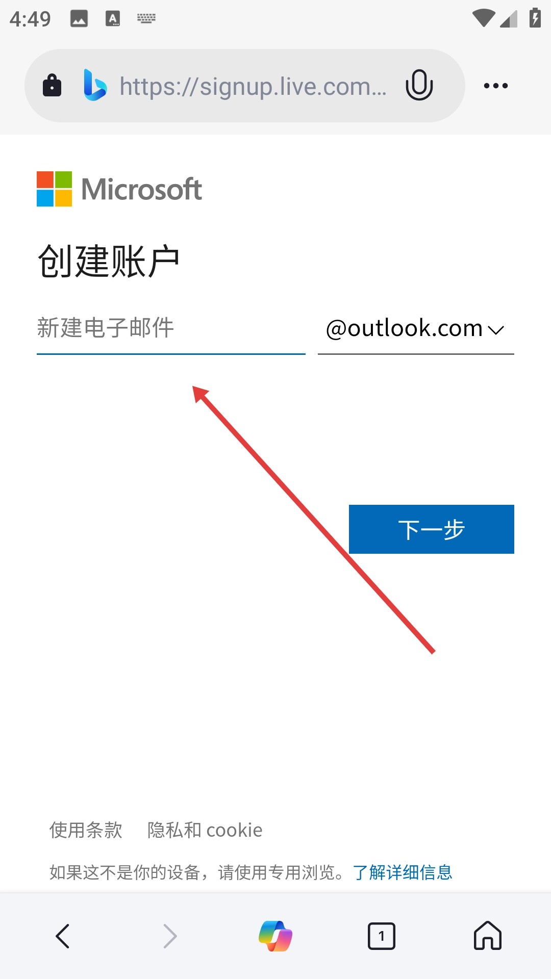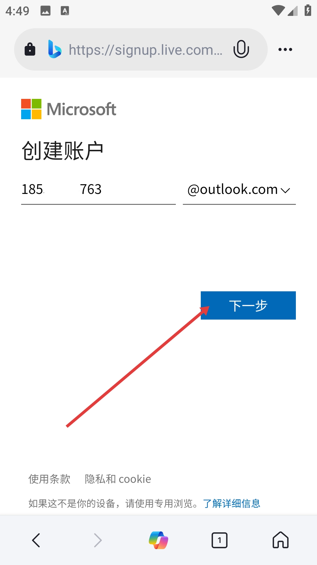 4、输入操作完成后,点击界面上的【下一步】按钮,接着推进Microsoft账户的创建步骤,这样才能使用该账户对应的各项服务。