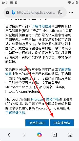 2、在数据传输说明页面点击【同意并继续】按钮,即可进入创建账户的具体操作页面。