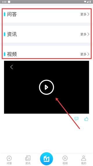 4、在主页的【问答】【资讯】【视频】板块中,点击对应内容的播放按钮,即可查看相关信息。