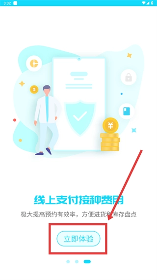 1、点击【立即体验】按钮,进入线上支付接种费用的服务平台,开启相关功能的使用。