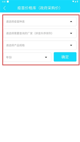3、进入疫苗价格库页面后,按顺序选择【疫苗种类】【厂家】【产品规格】【年份】这几项信息,然后点击【确定】按钮,即可查询到对应的价格。