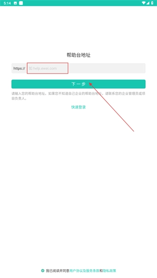 1、进入帮助台地址页面后,填写企业对应的帮助台地址,勾选相关协议,然后点击【下一步】按钮,即可进入后续操作流程。