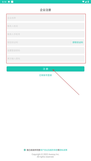 3、进入企业注册页面后,按顺序填写企业名称、联系人信息、验证码,设置密码并确认无误后,点击【注册】按钮即可完成企业账号的创建。