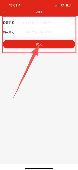 4、进入注册页面后,依次设置密码、确认密码,随后点击提交按钮,即可完成账号注册流程。