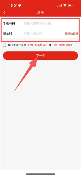 3、填写手机号码,点击获取验证码并输入,同意相关条款后点击下一步。