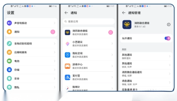此类通知选项均已开启。用户可通过点击手机“设置”跳转页面进行快速配置:设置→通知→“消防融合通信”应用→允许通知;且其他通知类选项也均为开启状态。