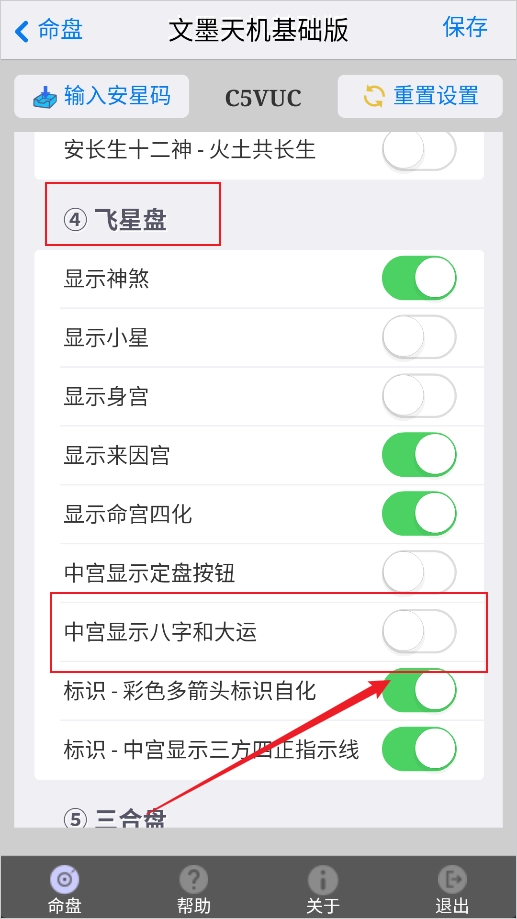 2、接着向下滑动页面,找到“飞行盘”选项,把“八字显示开关”和“大运显示开关”都打开就可以了