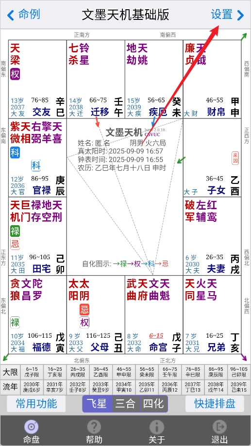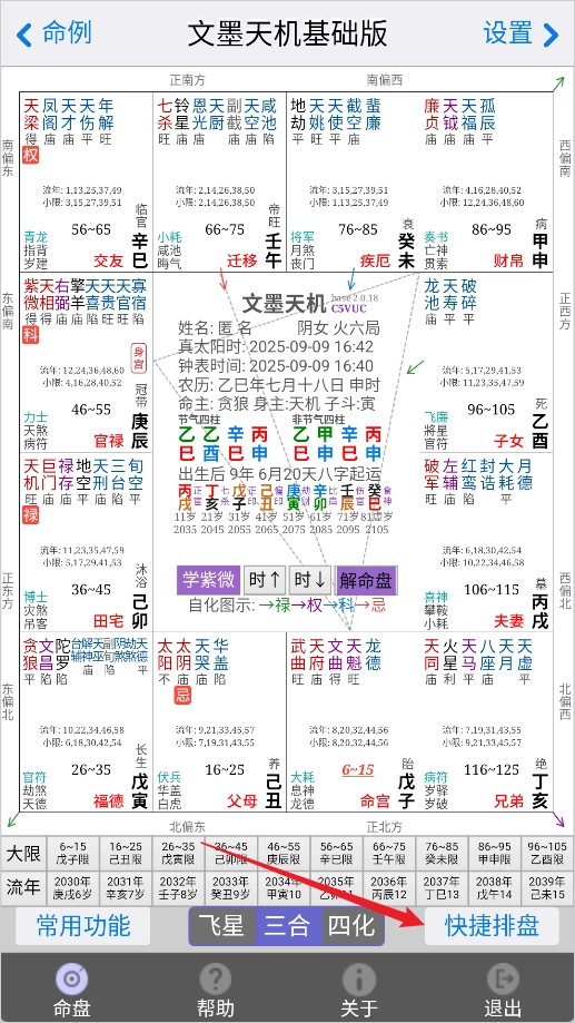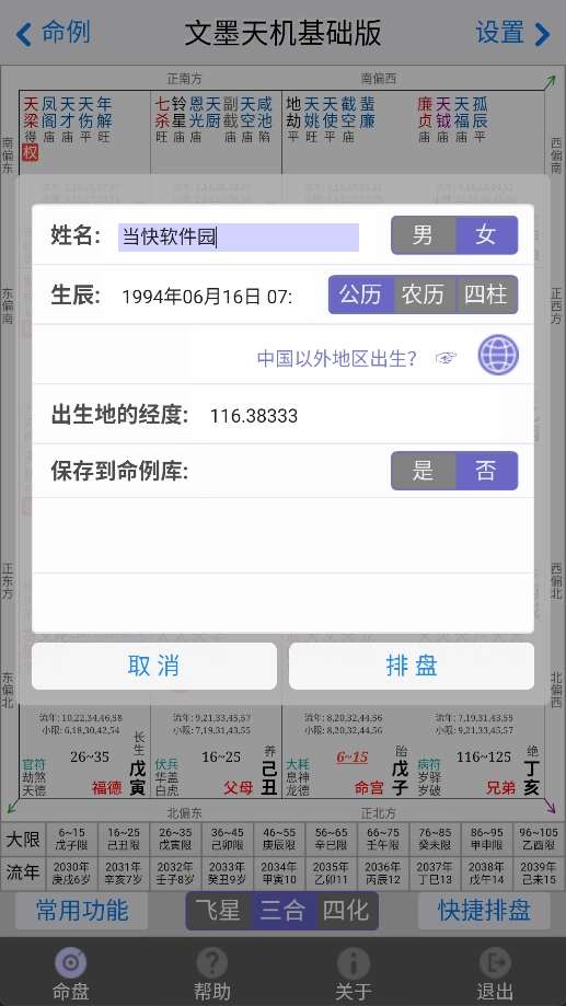 3、配备精心打造的排盘界面,风格简约却不失精致,既贴合命理师的专业操作习惯,也契合紫微斗数爱好者的日常使用偏好;盘面的布局逻辑与配色体系,均与市面上主流的飞星、三合排盘软件保持一致,能有效降低用户的上手难度。