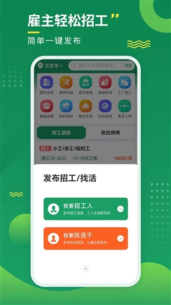 1、一键发布招工与找活信息,操作便捷高效,堪称招聘者的贴心利器,让招工人这件事变得轻松简单;既是工人群体的福利,也是招聘者的得力助手。省去诸多中间环节,实现招聘者与求职者的直接对接,让招工、找活、接活的过程更加简单快捷。