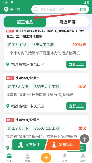 3、招工信息页面,所在城市默认显示为福州,支持相关工种的搜索功能,页面会呈现普工、快递分拣等招工岗位的详细信息,包括用工人数、工期时长、薪资待遇以及具体工作地点等内容。