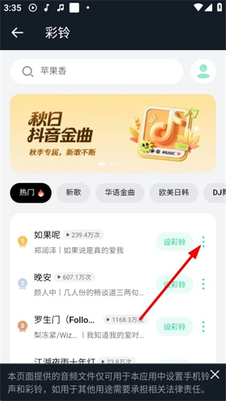 3、进入彩铃页面后,找到想要的歌曲,点击该歌曲右侧的三点图标,就能开展设置彩铃等相关操作。