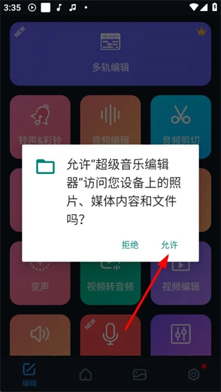 2、当【超级音乐编辑器】请求获取设备照片、媒体内容及文件的访问权限时,请点击【允许】按钮完成授权操作。