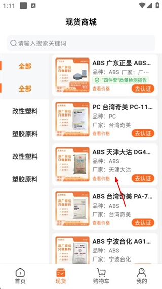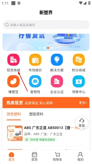1、启动新塑界应用,点击现货商城板块,即可进入现货商品的列表页面。