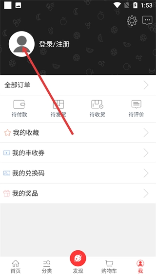 1、进入“我”的页面后,点击【登录/注册】入口,该页面可查看全部订单、我的收藏等功能。