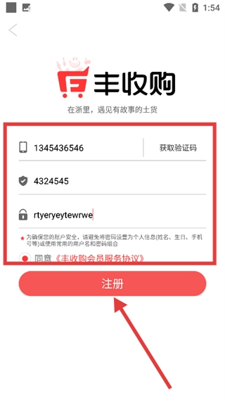 4、进入注册页面后,依次填写手机号、验证码和密码,勾选同意《丰收购会员服务协议》,再点击【注册】按钮,即可完成账号注册流程。