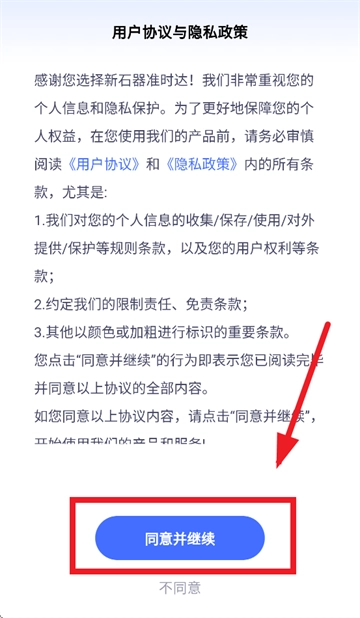 打开新石器准时达应用,在弹出的用户协议与隐私政策提示页面中,点击“同意并继续”按钮。