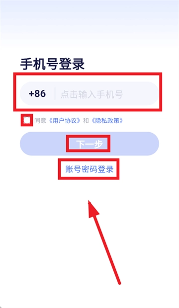 进入登录界面后,输入手机号,勾选同意《用户协议》与《隐私政策》,点击“下一步”获取验证码完成登录;此外,也可选择账号密码登录的方式,直接使用账号密码进行登录操作。