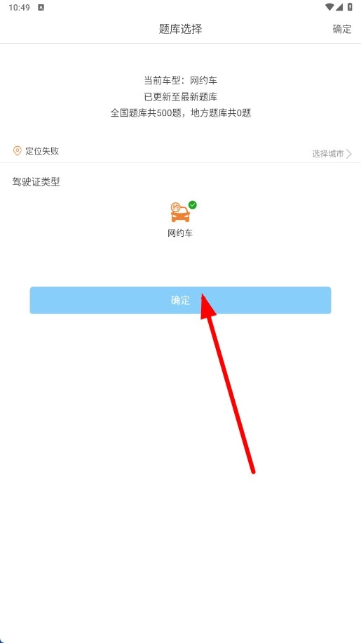 1、在题库选择页面,先确认车型,接着点击【确定-功能按钮】,即可进入网约车驾考页面。