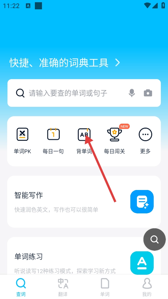 3、进入智能背单词页面后,点击【开始背单词】按钮,即可进入单词学习界面。