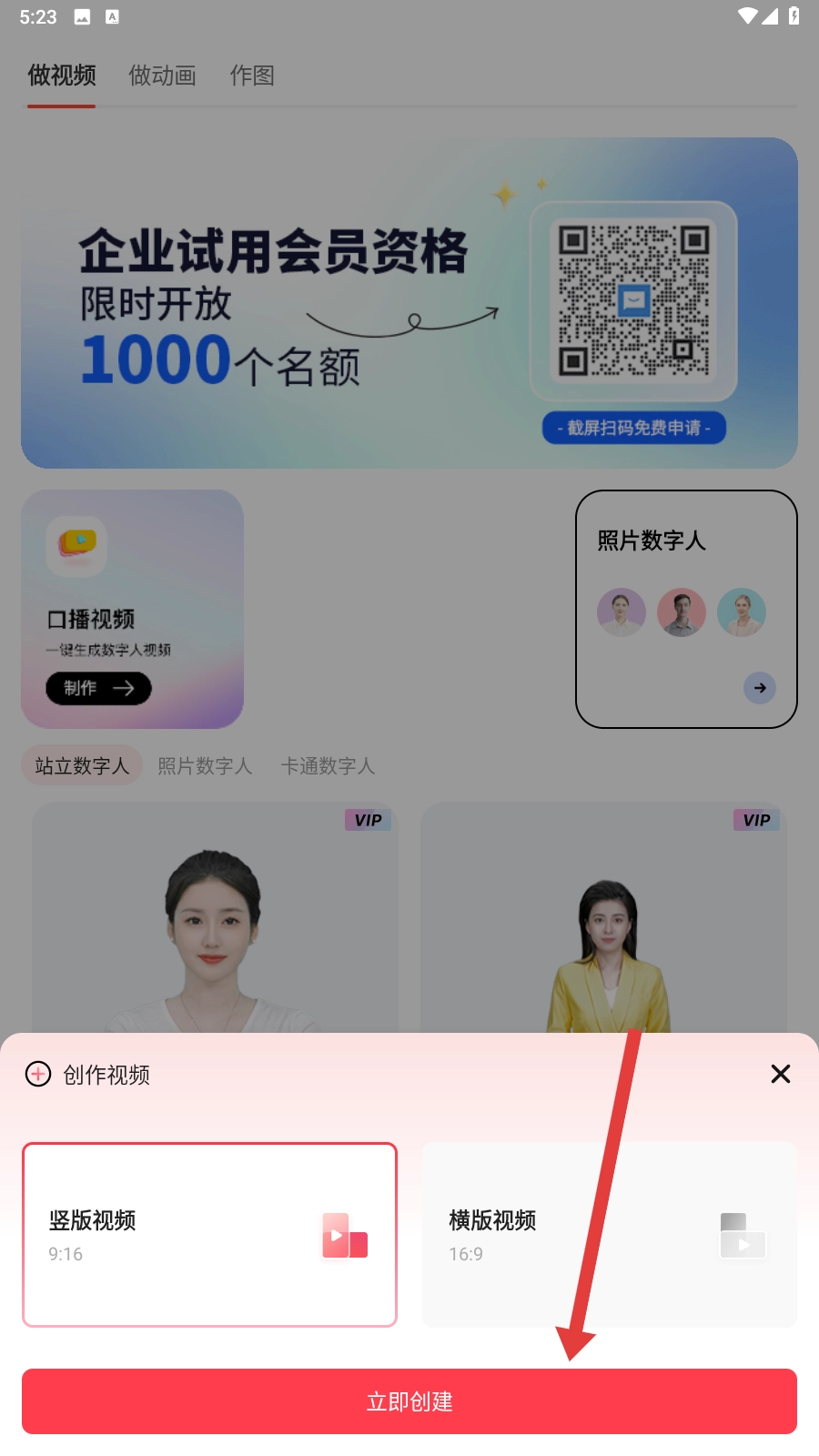 3、选好视频格式后,点击【立即创建】按钮,就能进入视频编辑界面,这样就离添加配音更近一步啦。