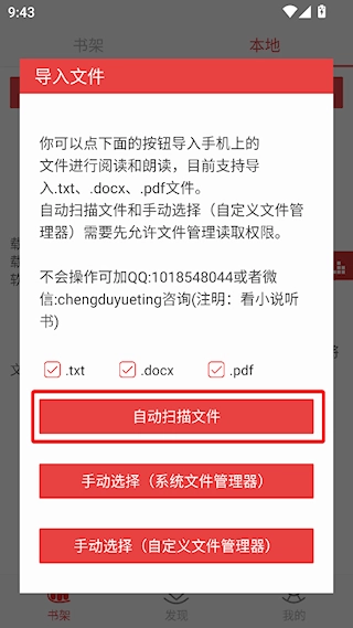 3、选择自动扫描文件,勾选扫描到的文件导入即可。
