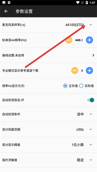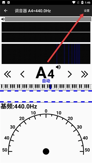 进入调音器界面后,点击右上角的【设置】按钮,就能进入参数设置页面,通过调整调音相关参数来满足实际需求。