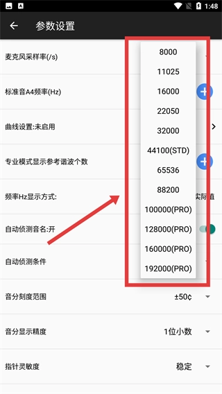 3、进入参数设置页面后,找到【麦克风采样率(/s)】这一选项,点击它右边的下拉框,就能看到当前可供选择的采样率设置。