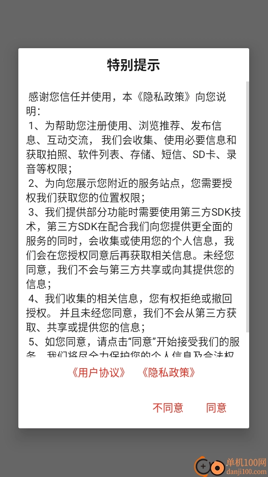 1、首先打开应用,阅读完“特别提示”内容后,点击“同意”按钮即可进入应用。