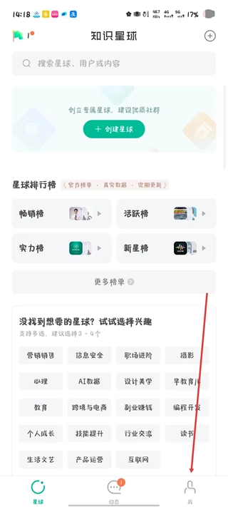 1、打开知识星球进入星球页面,点击底部我的选项,进入个人页面。