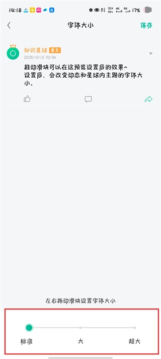 4、在字体大小页面拖动滑块选择标准大或超大,选好后点击保存按钮。