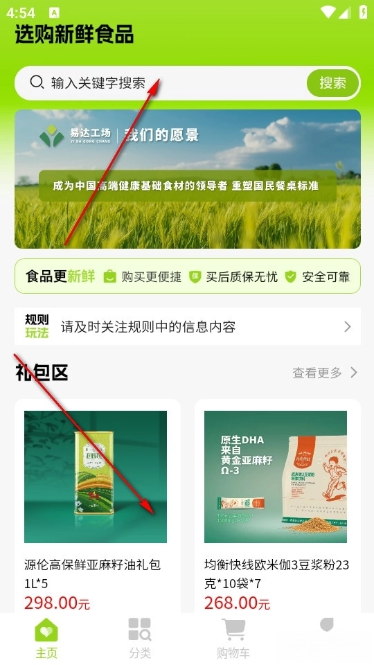 点击软件进入首页,在上方搜索自己所需的产品,也能够在下方直接浏览寻找所需商品。