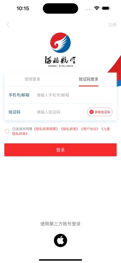 1、打开进入软件以后,在出现的页面中点击下方的“登录”,登录个人河北航空帐户。如果没有注册,可以用使用手机号注册帐户。